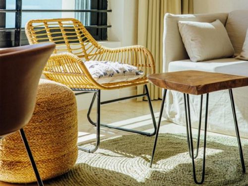 - The living room has a sofa, furniture with smart TV and dining table with chairs.