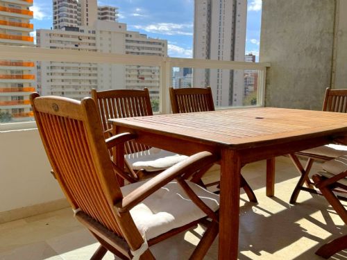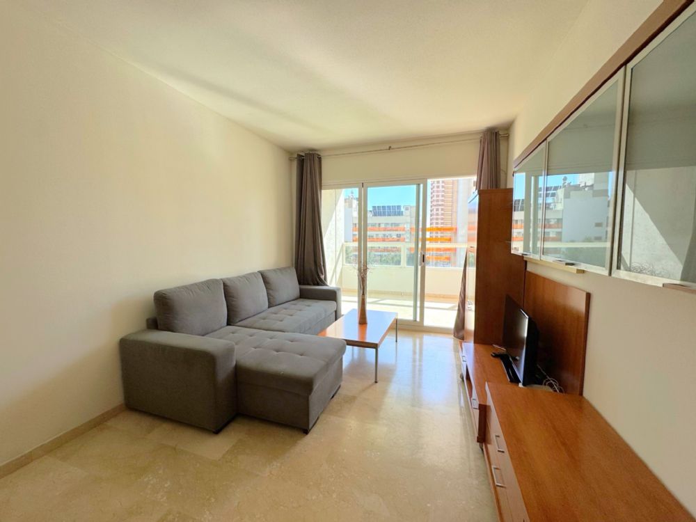 - El segundo dormitorio tiene 2 camas de 90 cm x 190 cm y una mesita de noche, armario empotrado y vistas a la ciudad de Benidorm.